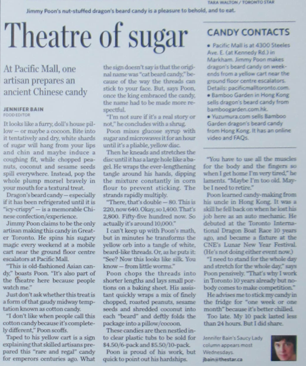 Poon learned candy-making from his uncle in Hong Kong. It was a skill he fell back on when he lost his job here as an auto mechanic. He debuted at the Toronto International Dragon Boat Race 10 years ago, and became a fixture at the CNE's Lunar New Year Festival (He's not doing either event now.)